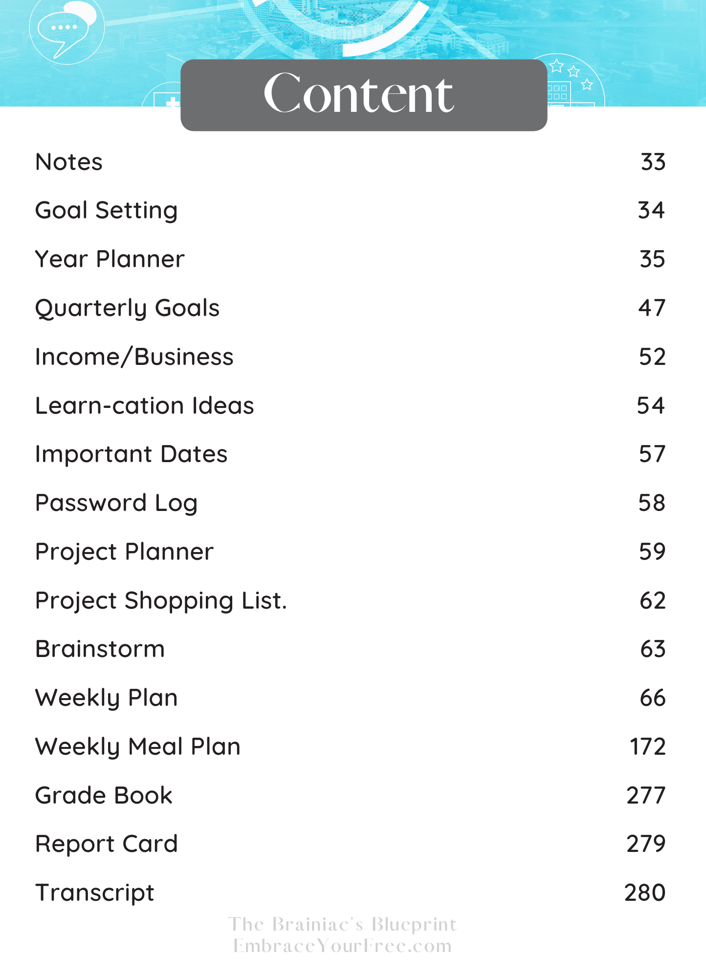 With the Brainiac's Blueprint Planner, you’ll have everything you need to plan, organize, and keep track of your homeschool journey, ensuring that your child reaches their full potential. Here's an in-depth look at what this incredible planner offers: